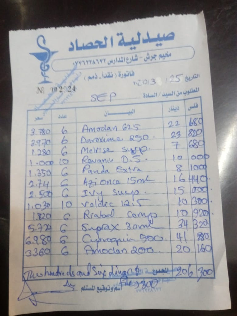 March 25th, 2020 - Mission 1 accomplished! Dr Mohammad Aradeh was able to get to the Pharmacy and purchase the needed, with the first 300$ available: